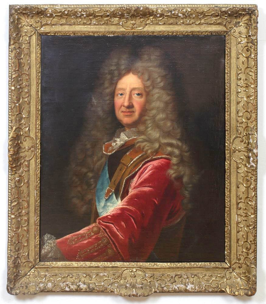 - 4. Huile sur toile. Atelier de Rigaud. H. 81 ; L; 65 cm. Inscription apocryphe au dos : « RENE DE FROULAY IIIe DU NOM // COMTE DE TESSE, Maréchal de France, Général // des Galères, Chevalier des ordres du Roi, Grand // d'Espagne, de 1ere classe, fisl aîné de René de // froulay IIe du nom, Comte de Tessé et de // Madeleine de Beaumanoir, Dame de Mangé // Né en 1651. Marié le 10 juin 1674 à // Marie-Françoise Auber, Baronne d'Aulnay // Mort le 30 mars 1725 // Peint par Hyacinthe Rigault »*. Allemagne, collection privée ; vente Saarbruck, Dawo Auktionen, 6 décembre 2025, lot. 82**.