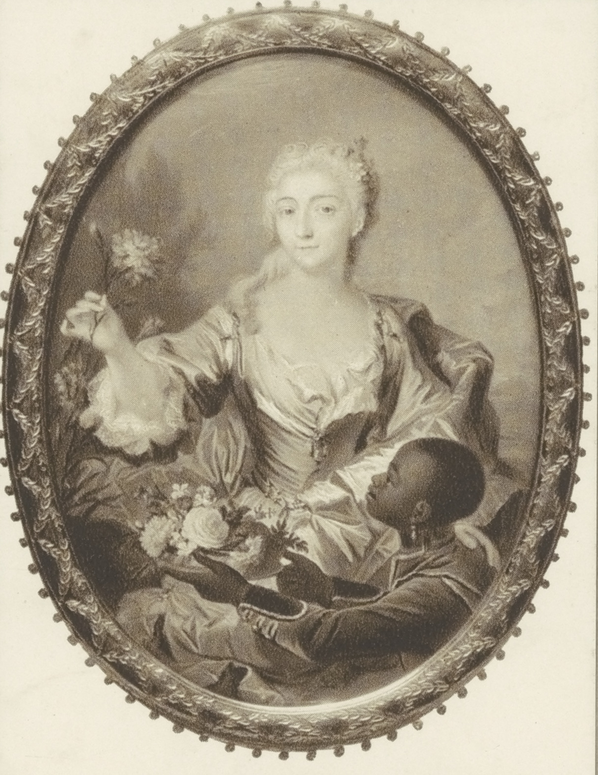 - 1. Huile sur toile d’après Rigaud. H. 142 ; L. 111. Localisation actuelle inconnue. Acquis par un particulier avant la vente à la Galerie Fabius en 1950 ; Vente Monaco, Sotheby’s, 20 juin 1987, lot 375 ; vente Sotheby's Paris, 4 novembre 2016, lot 566 [147 x 118 cm]. Selon nous il s’agit probablement du portrait dit à tort de la princesse de Conti, anciennement dans la collection Gellinard (et qui fut vendu avec son pendant figurant Vertumne et Pomone [P.796] et identifié également alors comme effigie de la marquise de Prie. Lors d’une vente de tableaux anciens à Drouot (Bellier, Mathey, Prost), salle 6, le 16 novembre 1942, il était décrit ainsi : lot 19 : « La Princesse de Conti. La fille de Louis XIV est representée dans un parc, en robe de satin bleu, retenant son manteau sur les epaules. Elle cueille et regarde un œillet pour l’ajouter a une corbeille de fleurs qu’un petit negre vêtu de velours jaune tient devant elle. Toile. — Haut., 1 m. 42 ; Larg., 1 m. 12. Collection Gellinard, n° 38 du catalogue de la vente (Hotel Drouot, 19 mars 1888). Collection Mazure-Six. »