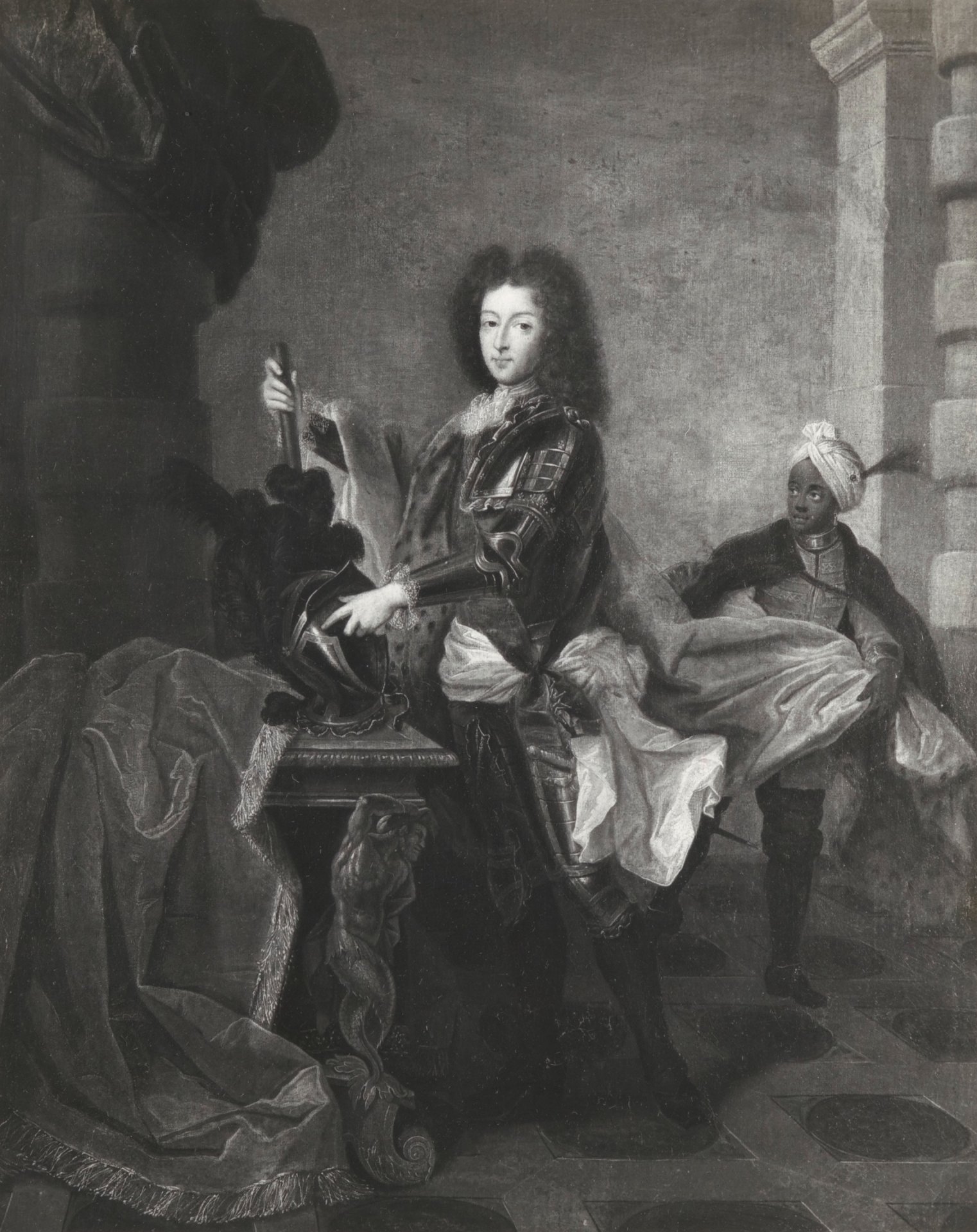 Dans une lettre à la raugrave Louise datée du 15 octobre 1719, la princesse Palatine attestait quant elle avoir reçu un exemplaire, sans doute en buste (Briefe der Herzogin Elisabeth Charlotte von Orléans. hrsg. von Wilhelm Ludwig Holland. Stuttgart [u.a.], Bibliothek des Litterarischen vereins in Stuttgart, 88, 107, 132, IV, lettre n°1063, p. 270). Les différentes copies connues tendent à prouver que l’estampe fut réalisée dans le même sens que la toile. Le prince est présenté debout, dans un environnement palatial, le casque et le bâton de commandement qu’il tient, disposés sur une lourde table dont les pieds figurent des atlantes. Un jeune serviteur maure soutient le manteau de Conti. Notons qu’en 1699, notre modèle passera commande à Rigaud d’une copie du portrait du Grand Dauphin, estimée à 140 livres (Roman, p. 74) et dont Adrien Leprieur fut chargé de retoucher la tête, la perruque et le fond (6 livres).