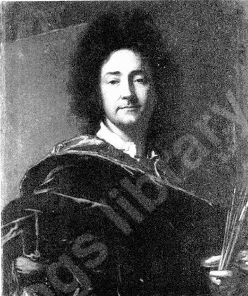 - 1. Huile sur toile d’après Rigaud. H. 39 ; L. 28 cm. Vente Milan, Sotheby’s, 18 mai 2004, lot 475. Ancienne collection romaine (piazza Farnese). La toile reprend le visage de face de Rigaud dans un traitement singulièrement peu soigné. Importante bordure de style romain.
