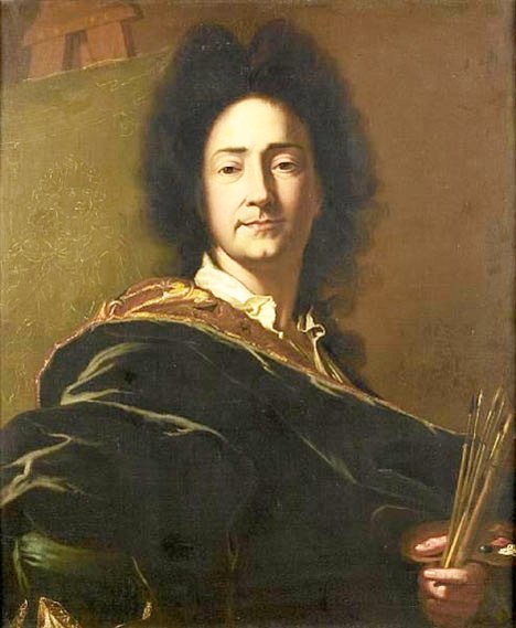 Absent des livres de comptes ; une première version fut peinte en 1706 pour la galerie de portraits du duc Comes III de Médicis. Le bateau qui la transportait à Florence fit naufrage et Rigaud refit son autoportrait à l’identique en 1716 ; Florence, coll. Médicis (Coridore Vasari, milieu du Ponte Vecchio, côté droit Nord-Ouest).