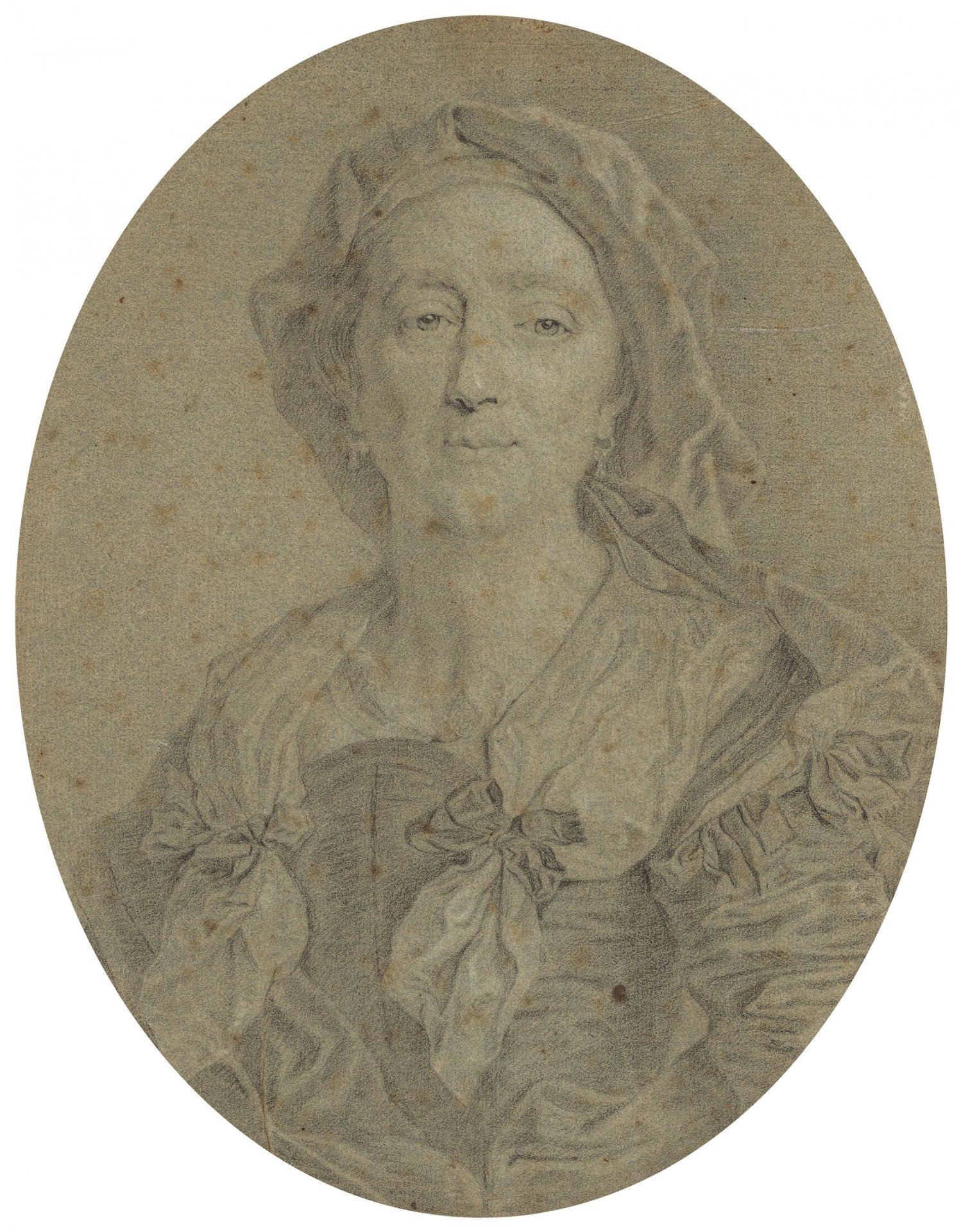 Lors de sa vente en 2026, ce dessin inédit a été pleinement attribué à la main de Rigaud comme préparatoire à la gravure. L'on sait en effet que l'artiste fournissait à ses graveurs différentes feuilles « pour les guider » dans leur interprétation de l'œuvre peinte, elle-même réalisée dans le sens inverse de l'estampe ici. Rigaud se serait donc contenté ici de l'image de sa mère sans anticiper le décor paysager de fond qui sera reproduit par Drevet. Il est propable qu'il ait pu exister d'autres dessins plus aboutis, notamment un de la bordure de bois du cadre représenté in fine ainsi qu'un du grand rideau qui l'enveloppe sur l'estampe.
