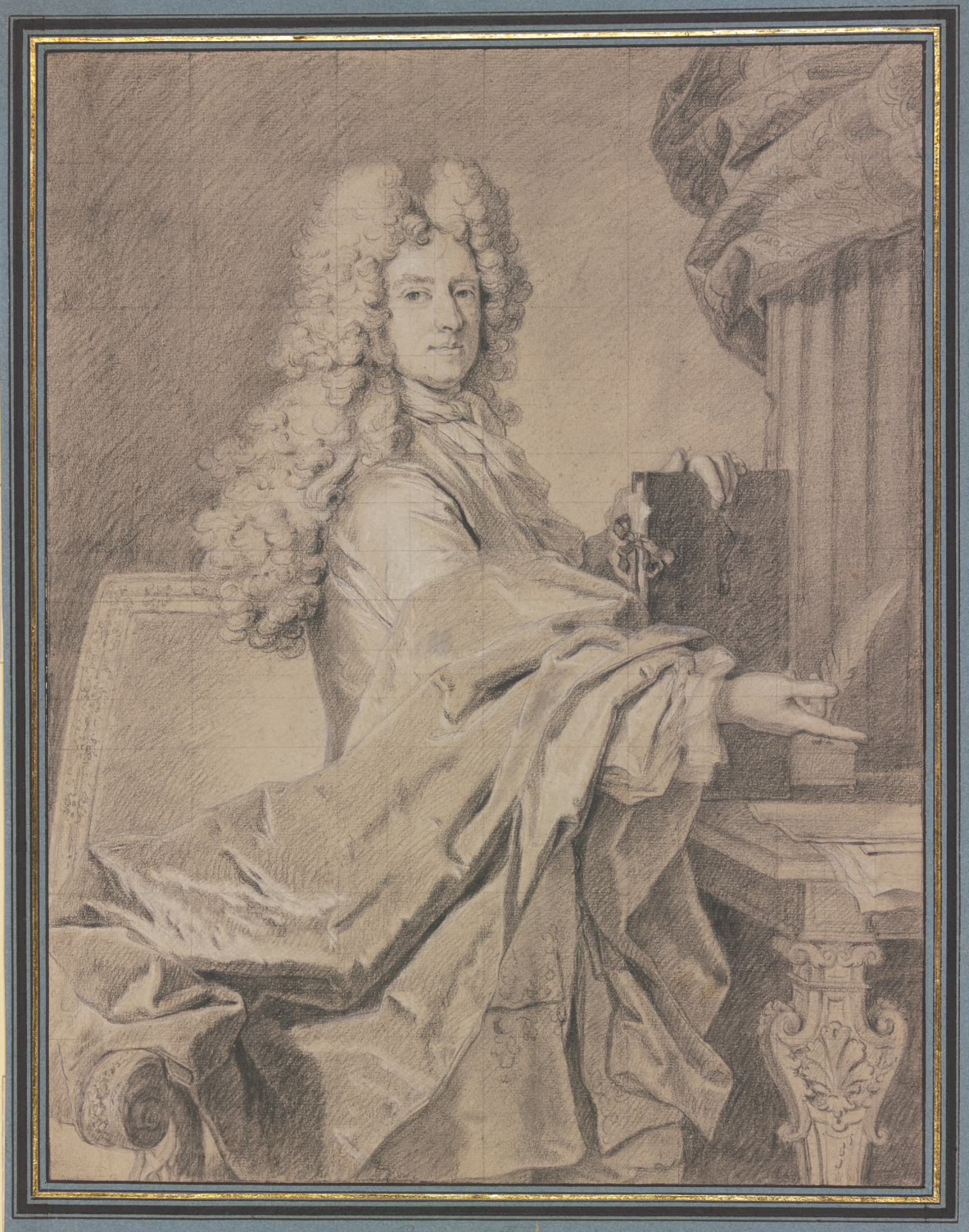 Bien que l’on sache le jeu hasardeux, on se prend vite à vouloir mettre un nom sur ce visage fier, sur lequel on devine quelques repentirs, sur l’arête du nez mais aussi sur la main posée sur le carton à dessin. Compte tenu du style des meubles et, surtout, de la perruque, on suppose que le modèle frappa aux portes de l’artiste dans les années 1705-1710, intervalle durant lequel Rigaud commissionna Charles Viennot et Jean-Baptiste Monmorency pour la reproduction en dessin de ses plus belles productions. D’une valeur d’au moins 6 livres, prix habituel pour une feuille de cette dimension, le dessin pourrait être l’évocation du portrait de Charles Collin des Tourelles, maître de musique (1699), ingénieur du roi (1690) et professeur de mathématiques, œuvre portée à l’année 1708 au crédit de Monmorency.