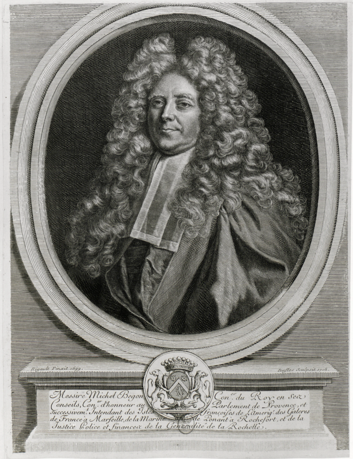 Sous le trait carré, la lettre suivante : « Messire Michel Begon, conseiller du roi en ses conseils, conseiller d’honneur au parlement de Provence et successivement intendant des îles françoises de l’Amérique, des galères de Marseille, etc.. ».