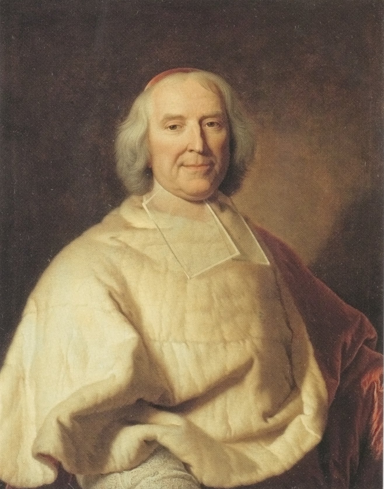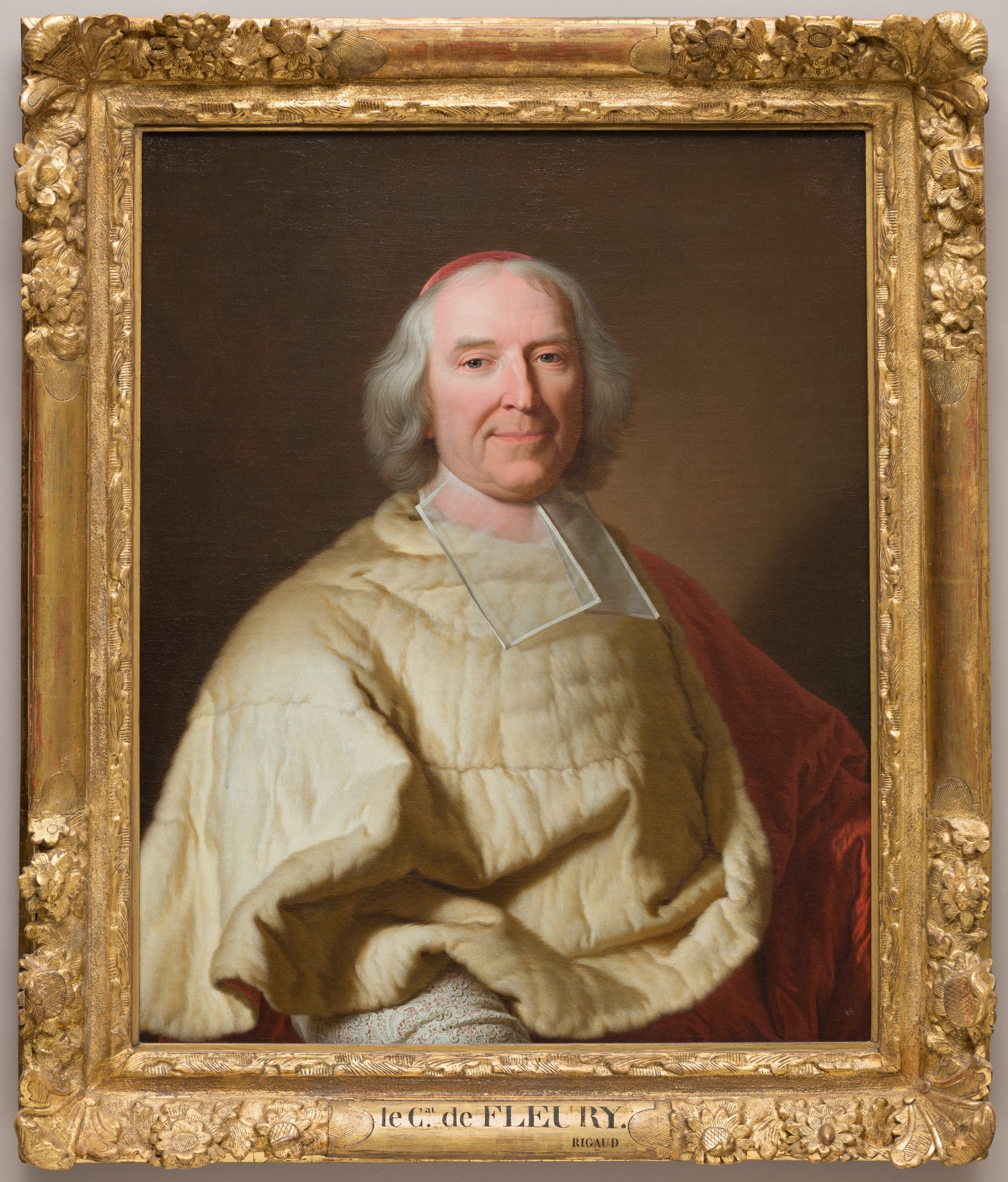 Ce nouveau portrait du cardinal de Fleury après celui, peint en buste en 1706 [PC.915], est autant une glorification du statut du principal ministre de Louis XV qu’une commémoration de sa nomination, en 1726, au titre de cardinal. Rigaud a simplement réutilisé ici les traits de l’ancien évêque de Fréjus peints 22 ans plus tôt pour les adapter au sein d’une composition ronflante de grande envergure, à mi-corps, proche de celle utilisée pour le portrait du cardinal Dubois [P.1320]. Le modèle est ainsi représenté assis dans un large fauteuil aux accoudoirs décorés de feuilles d’acanthes ; meuble ayant sans doute appartenu au peintre car on le retrouve à maintes reprises sur les portraits produits à partir de 1720. Son riche dossier fait écho à la richesse du décorum et à la verve des drapés de la robe rouge sang du cardinal. Fleury croise ses mains sur son couvre-chef et pose dans un environnement probablement imaginaire fait d’un fond de mur à pilastres, séparé du premier plan par une bordure de pierre sur laquelle vient se déposer en cascade un lourd rideau doublé de brocart.